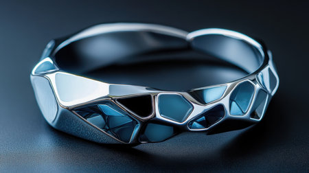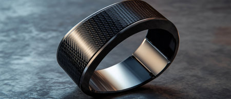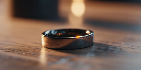 Sleek metallic ring with reflective finish on glossy surface.