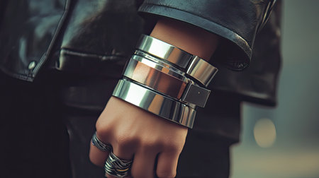 A close-up view of a hand adorned with stylish metallic bracelets, wearing a black leather jacket. This image captures modern fashion aesthetics in an urban environment.