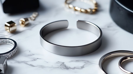 This image showcases a stylish arrangement of modern jewelry, including sleek metal bracelets, set against a beautiful marble background, accentuating elegance.