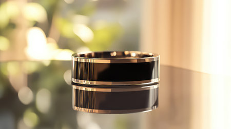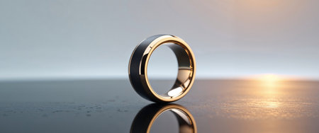 AI Generated. Stylish Gold Smart Ring Device on Reflective Surface for Technology Concept