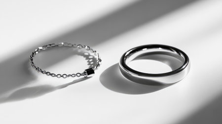 A pair of elegant silver rings displayed on a minimalist surface, showcasing beautiful reflections and soft shadows in a captivating light interplay.