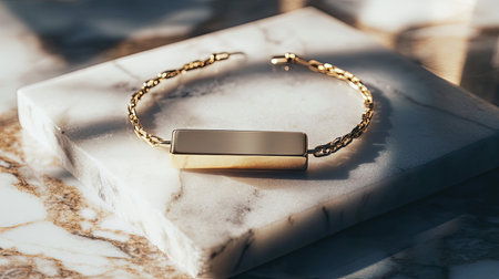 A stunning gold bracelet features a sleek design, resting on a luxurious marble surface. Ideal for showcasing elegance and sophistication in fashion jewelry.