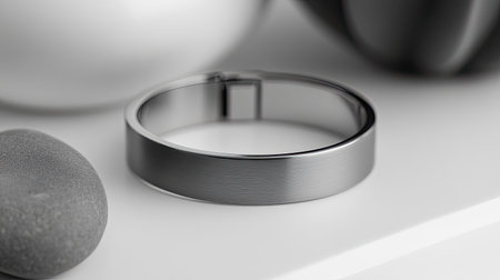 A graceful silver ring placed on a sleek surface beside smooth stones and soft focus decorative elements, showcasing modern elegance and design.