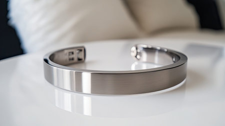 A sleek and modern metallic bracelet rests elegantly on a table, set against a soft textured background, showcasing contemporary design elements and luxury craftsmanship.