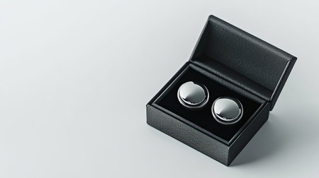 A close-up view of elegant silver cufflinks beautifully arranged in a sleek black box, perfect for formal wear and special occasions, showcasing timeless luxury.