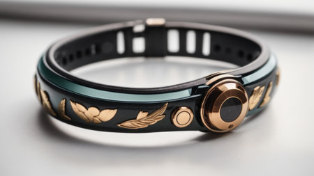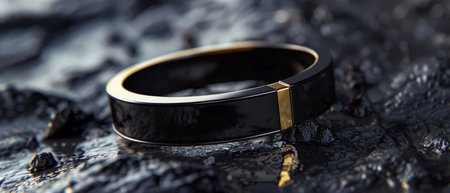 A stylish black and gold bracelet elegantly rests on a reflective surface, surrounded by soft natural light, creating a luxurious and modern atmosphere.