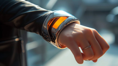 Futuristic watch with heart rate monitor and pulse oximeter.