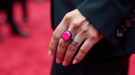 Close-up of female hand with pink ring on red carpet at event with black suit.
