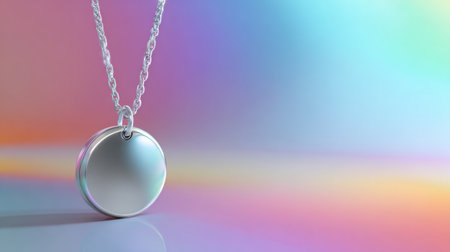 A beautiful silver pendant necklace displayed against a vibrant, colorful iridescent background, capturing elegance and modern design for jewelry enthusiasts.