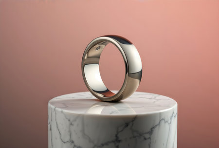 Luxury Smart Ring. Sophisticated metallic smart ring with polished finish displayed on marble pedestal with soft gradient background.