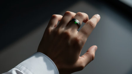 Close up of a hand wearing a smart ring with a green indicator light.