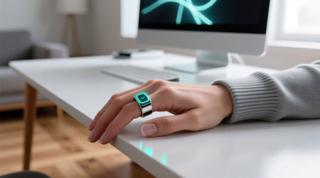 Hand wearing a smart ring with a glowing icon on a modern office desk.