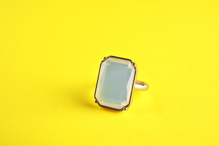 Beautiful bijouterie. Elegant ring on yellow background