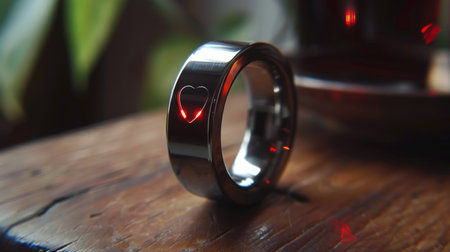 This image showcases a sleek modern smart ring with glowing icons, representing health monitoring and communication features on a wooden table, illuminated by soft lighting.