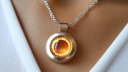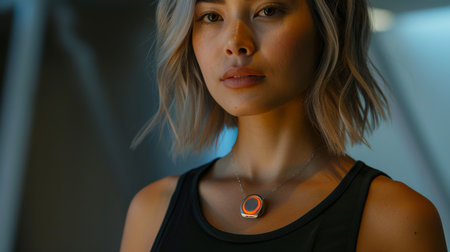 Modern Woman Posing Confidently in Futuristic Setting With Stylish Necklace at Indoor Location With Soft Lighting. Generative AI