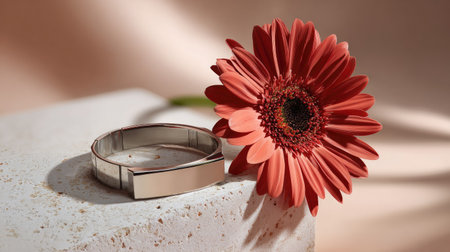 A stunning silver bracelet lies beside a vibrant red flower on a soft background, creating an elegant still life composition perfect for jewelry and fashion themes.