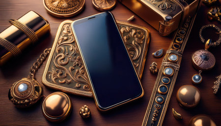 A golden smartphone is elegantly positioned among decorative accessories, showing a blend of modern technology and classic artistry.