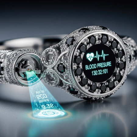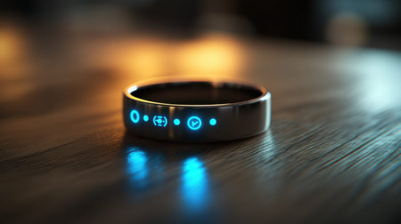 Futuristic glowing smart ring on finger highlights wearable tech blending style innovation and subtle biometric data monitoring.