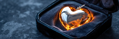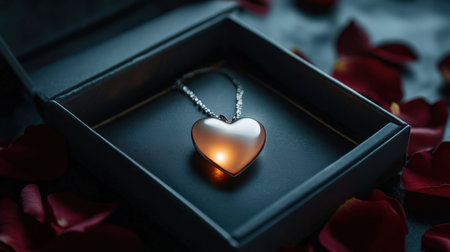 A glowing heart pendant nestled in a gift box with rose petals
