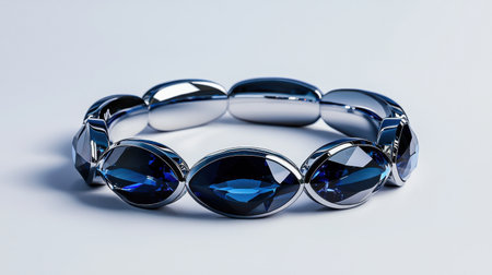 A silver bracelet with blue stones on it. The bracelet is long and has a shiny appearance. The blue stones are arranged in a way that creates a sense of movement and flow
