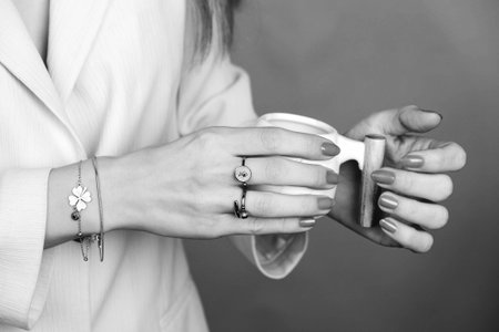 A close-up of a woman's hand adorned with a sleek silver bracelet and elegant rings, captured in a soft focus setting that enhances the charm and sophistication.