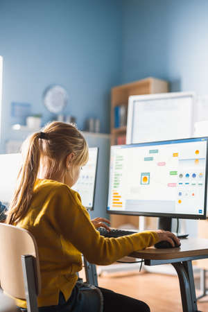 Elementary School Computer Science Classroom: Cute Little Girl Uses Computer, Learning Programming Language for Software Coding. Schoolchildren Getting Modern Education. Vertical Over the Shoulder