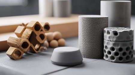 A close-up view of various concrete objects, including smooth cylinders, a textured cylindrical container, a hexagonal piece, and a small, flat, round item, all arranged on a light-colored surface.
