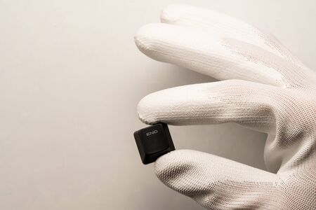 A hand in a white glove holds a black keyboard button with a white END inscription on a white background close-up