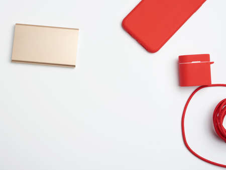 golden power bank, red smartphone and cable in textile braid on a white background, close up, flat lay, copy space