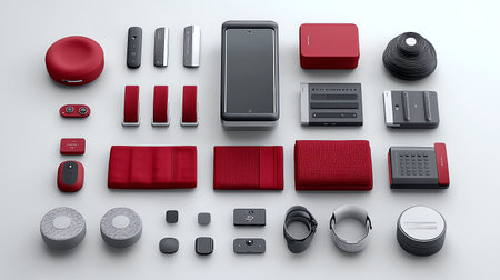 A neatly organized flat lay of electronic accessories on a white surface, highlighting the simplicity and functionality of modern technology for everyday use.