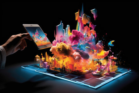 A person holds a tablet in front of a model of a city, analyzing and planning urban development, Augmented reality displayed in a colorful explosion of pixels and light, AI Generated