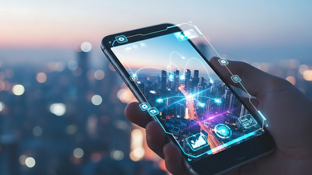 A hand holding a smartphone with a futuristic cityscape on its screen, set against a blurred cityscape background at dusk, symbolizing the integration of technology and urban life.