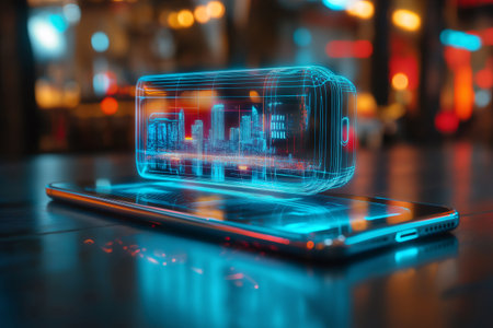 Holographic projection of a futuristic cityscape emerging from a smartphone, showing innovative technology and urban development