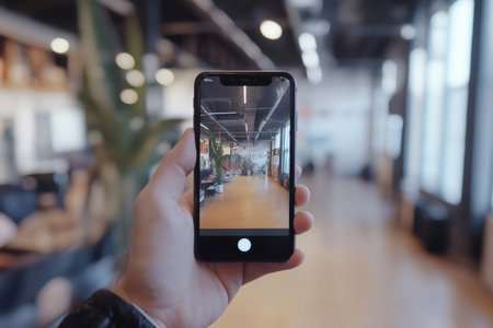 Hand holding a smartphone, recording a video tour of a modern office space, highlighting the stylish interior and innovative design elements