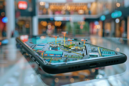 Smartphone displaying 3D model of city on glass table in shopping mall