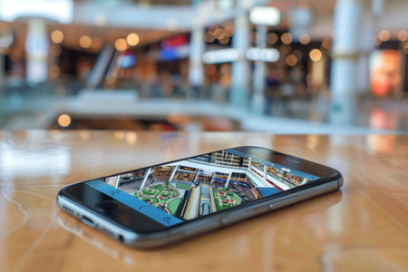 Modern smartphone on table in shopping mall with blurred background, technology concept
