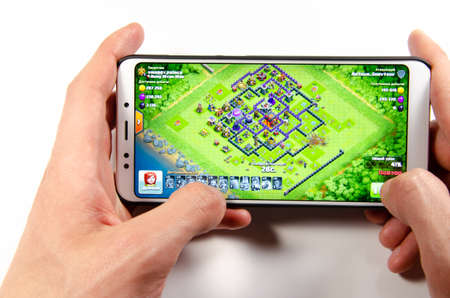 April, 2019. Kramatorsk, Ukraine. Clash of Clans gameplay on a white smartphone in hand