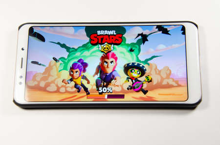 April, 2019. Kramatorsk, Ukraine. Brawl Stars gameplay on a white smartphone in hands