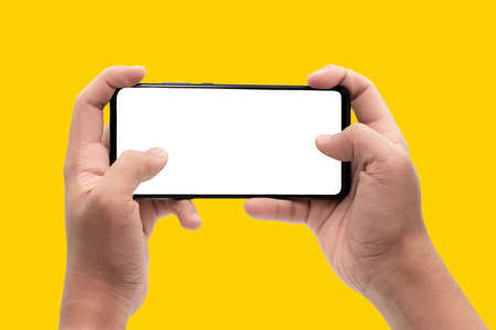 man holding a phone in his hands on a yellow background. Place for your text. View from above