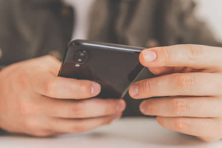 Closeup of Hand Using Mobile Phone. Cropped image. Selective Focus. Using Smartphone for Communication, Texting, Reading or Playing Game