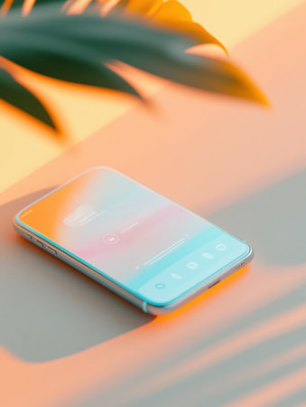 A sleek smartphone rests on a textured surface, exhibiting colorful reflections and a vibrant atmosphere. Ideal for technology and lifestyle themes.