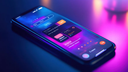 Close-up view of a smartphone screen showing a digital wallet interface with transaction details and vibrant glowing icons against a gradient background.