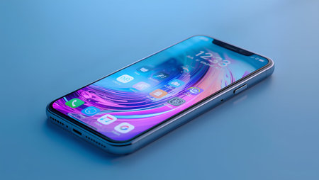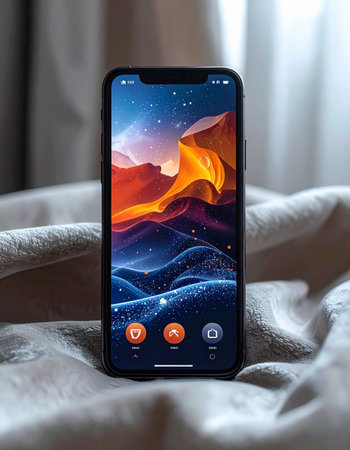 Close up view of a modern smartphone with a colorful fractal on the screen.
