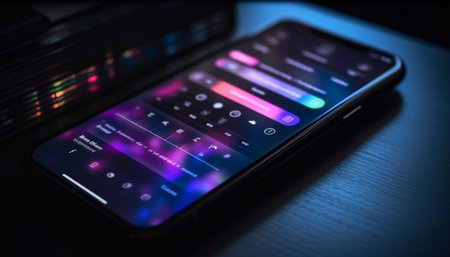 Hand holding illuminated smart phone, close up of touch screen technology generated by artificial intelligence