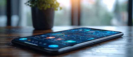A smartphone lies on a dark blue surface, showcasing a social media news feed with various articles and notifications.