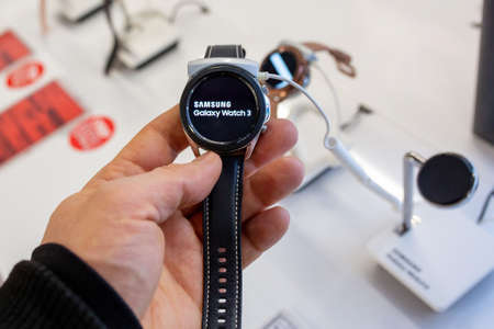 Buyer viewing new Samsung Galaxy Watch 3 model in electronic store. Samsung Galaxy Watch 3 in hand. Gadget showing brand logo name on screen. Minsk, Belarus - February 16, 2022