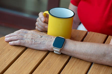 Senior woman with modern smart watch drinking morning coffee. Smart watch with empty black screen, space for your design. Healthcare and technology concept.