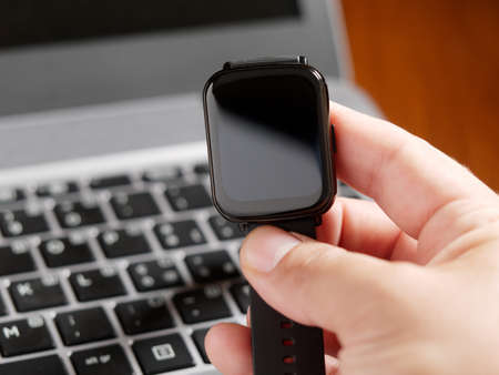 Male hand checking smartwatch keyboard of his laptop computer. Man working on laptop at a desk