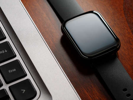 smart watch or smartwatch and laptop on the desk wearable technology sport smartwatch on fitness run walk outside financial data