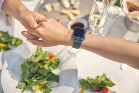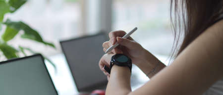 Close up view of female looking on wristwatch while working with digital devices in cafe